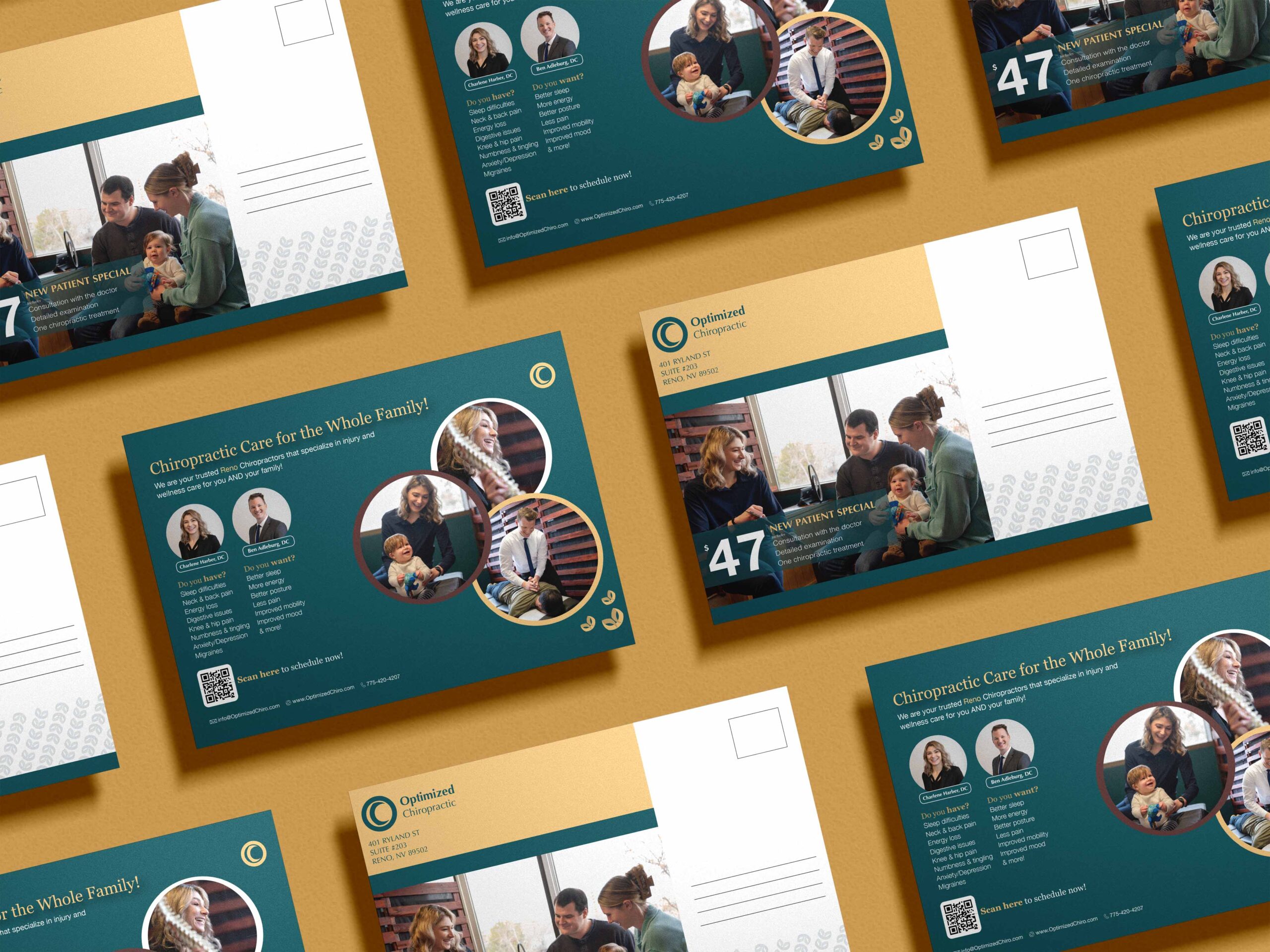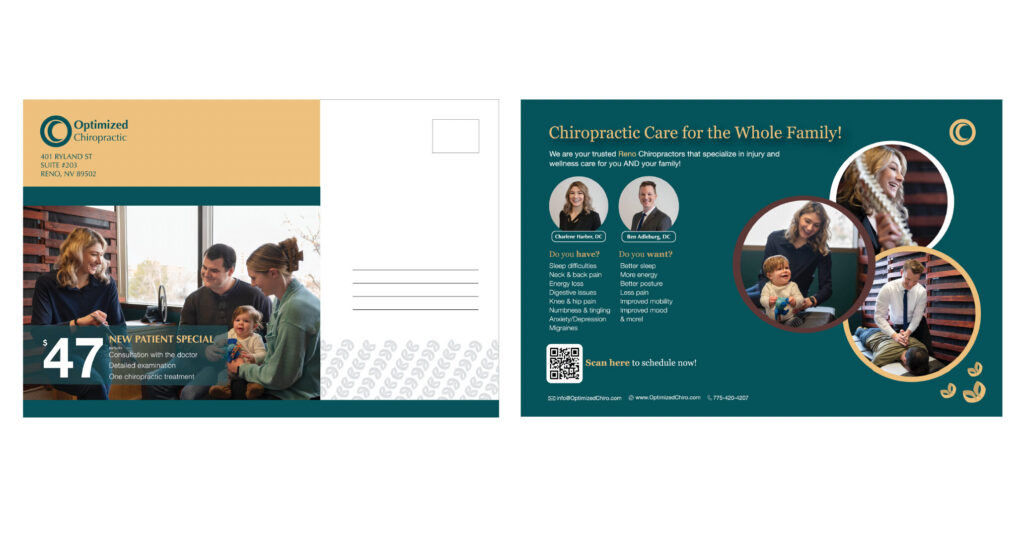 Designed a direct-mail marketing postcard distributed to over 500 families in the Reno, Nevada area for a local chiropractic office called Optimized Chiropractic. The piece was created to drive action through a QR code, encouraging recipients to book appointments focused on family-centered chiropractic care, pain relief, and improved quality of life. All design and layout elements were developed by me, with the exception of the primary logo, brand colors (teal and gold), and photography, which were provided by the client.